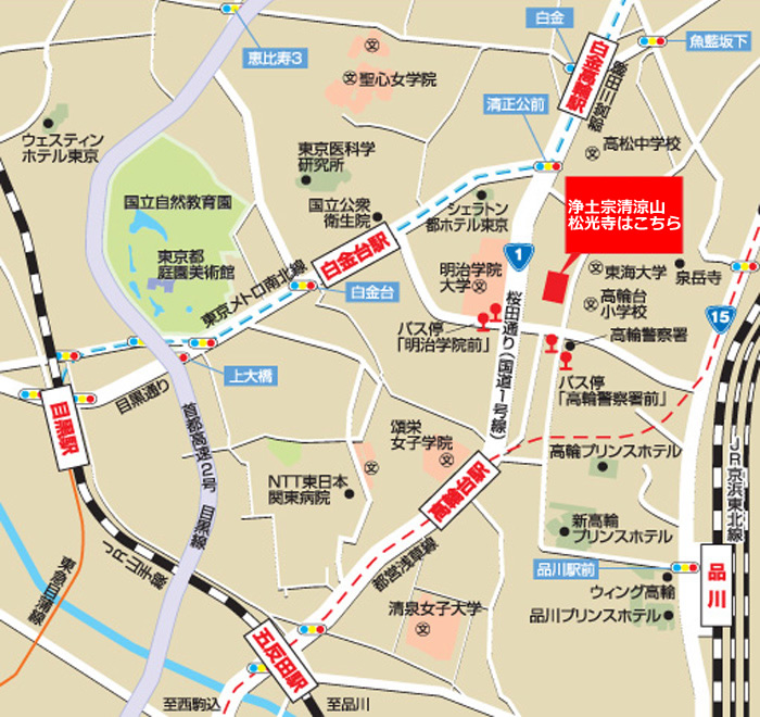 交通について 2025.09.222025.09.23 所在地 〒108-0074 東京都港区高輪1-27-18 電車でお越しの方 都営浅草線「高輪台駅」より徒歩約7分 東京メトロ南北線「白金高輪駅」より徒歩約7分 JR山手線「品川駅」高輪口より都営バス「目黒行」乗車、「高輪警察署前」下車 徒歩約1分 JR山手線「目黒駅」東口より都営バス「大井競馬場行」乗車、「高輪警察署前」下車 徒歩約1分 お車でお越しの方 首都高2号目黒線 東京都庭園美術館沿い「白金台」方面へ約5分。 桜田通りを北上し、明治学院大学の交差点で右折、高輪警察署を左折。
