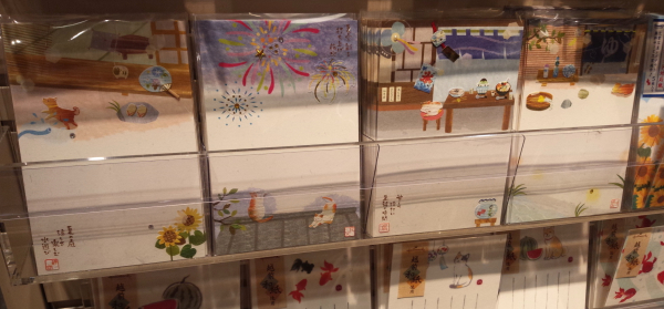 色とりどりの様々な暑中見舞いの葉書を見ることができました。写真だと分かりづらいのですが、キラキラ光る塗料が使われていたり、飛び出して見える絵柄があったりと、驚きで思わず笑みが漏れました。デザイナーの方々のおかげで葉書も日々進歩しているのですね。